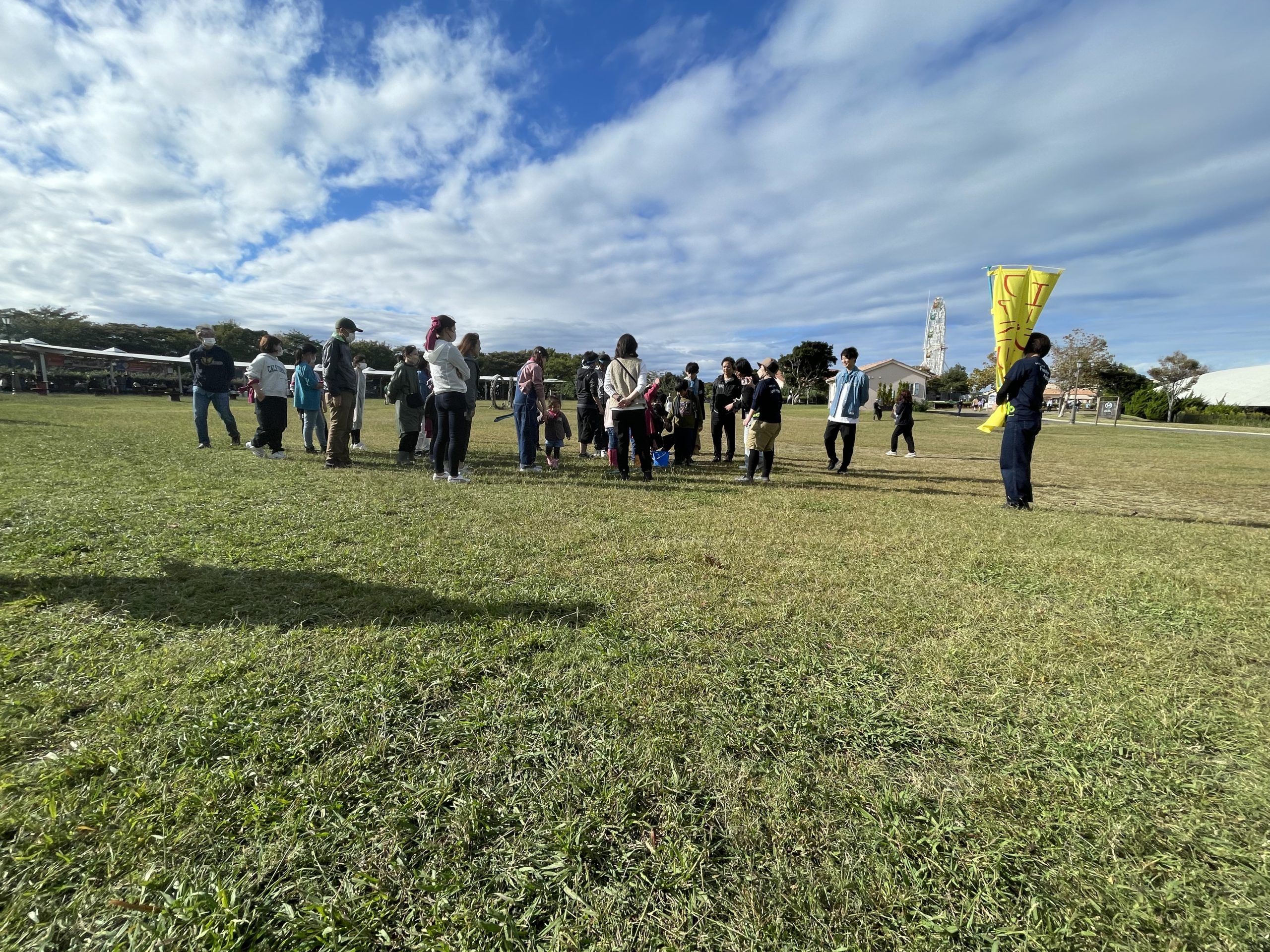 子どもたちと親御さんは、ラジオ体操沖縄バージョンで身体を温めてから『だるまさんがころんだ』。盛り上がってきたら『〇〇さんがころんだ』〇〇の生き物のジェスチャーで動きをで止めます。ぞう、うさぎ、ゴリラ、へび、カマキリ!どんどん出てくる生き物に笑いが止まらない。おもしろい生き物を言いたくてわざと鬼になってみたり。
